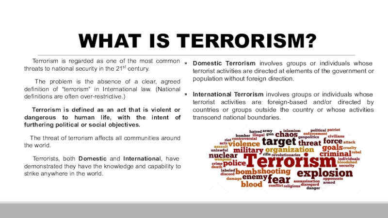 International Terrorism involves groups or individuals whose terrorist activities are foreign-based and/or directed by countries or groups outside the country or whose activities transcend national boundaries.