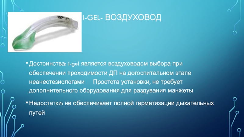 Достоинства: i-gel является воздуховодом выбора при обеспечении проходимости ДП на