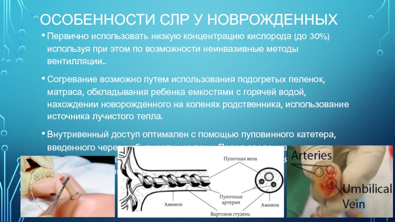 Внутривенный доступ оптимален с помощью пуповинного катетера, введенного через умбиликальную вену. Перед введением его необходимо заполнить 5% раствором. Глубина введения катетера 4-6см до появления венозного оттока.