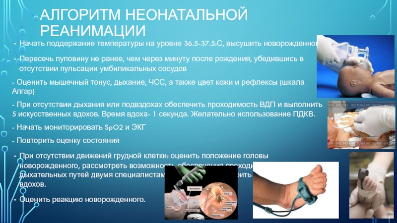 При отсутствии движений грудной клетки: оценить положение головы новорожденного, рассмотреть возможность обеспечения проходимости дыхательных путей двумя специалистами, интубации, повторить 5 искусственных вдохов.