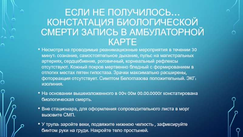 На основании вышеизложенного в 00ч 00м 00.00.0000г констатирована биологическая смерть.
