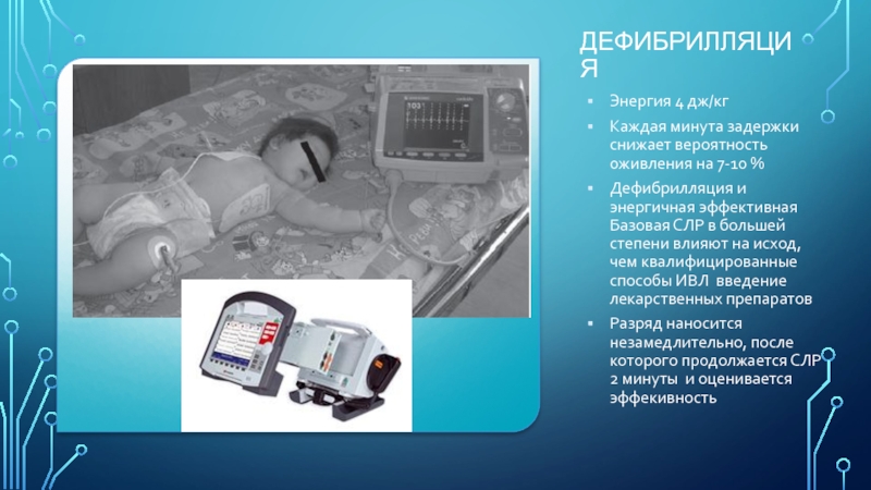 После оценки ритма при желудочковой тахикардия или фибрилляции желудочков выполнить дефибрилляцию 4дж/кг или, при наличии асистолии или электрической активности без пульса, продолжить базовый алгоритм в течении 1 минуты