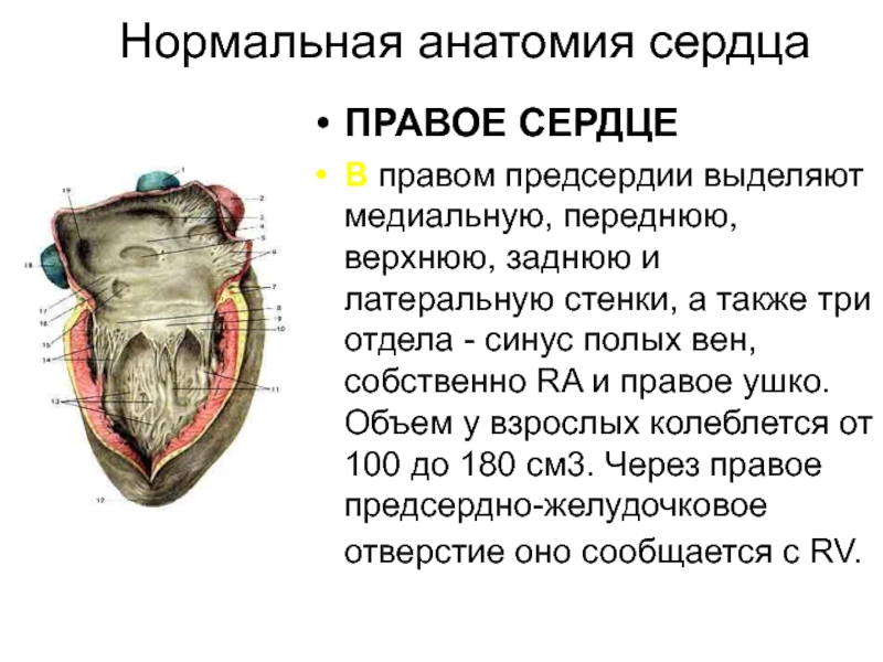полых вен, собственно RA и правое ушко. Объем у взрослых колеблется от 100 до 180 см3. Через правое предсердно-желудочковое отверстие оно сообщается с RV.