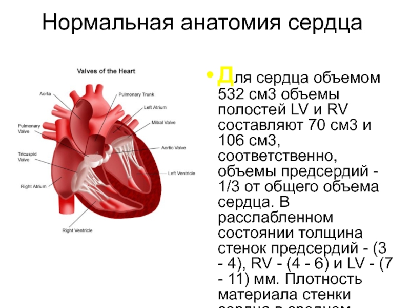предсердий - 1/3 от общего объема сердца. В расслабленном состоянии толщина стенок предсердий - (3 - 4), RV - (4 - 6) и LV - (7 - 11) мм. Плотность материала стенки сердца в среднем равна 1,06 г/см3.