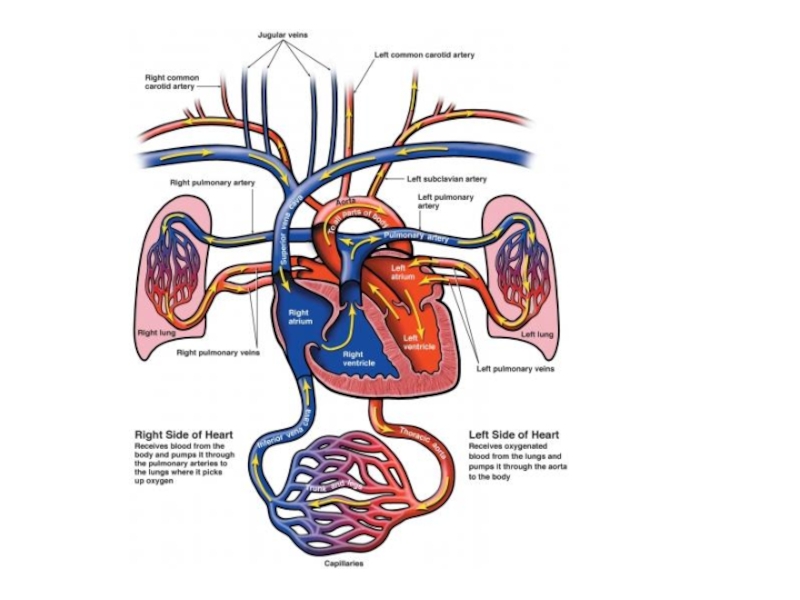Из правого желудочка и левого желудочка выходят, соответственно, легочная артерия (легочный ствол) и восходящая аорта. RV и LA замыкают SHCC, LV и RA - BCC.