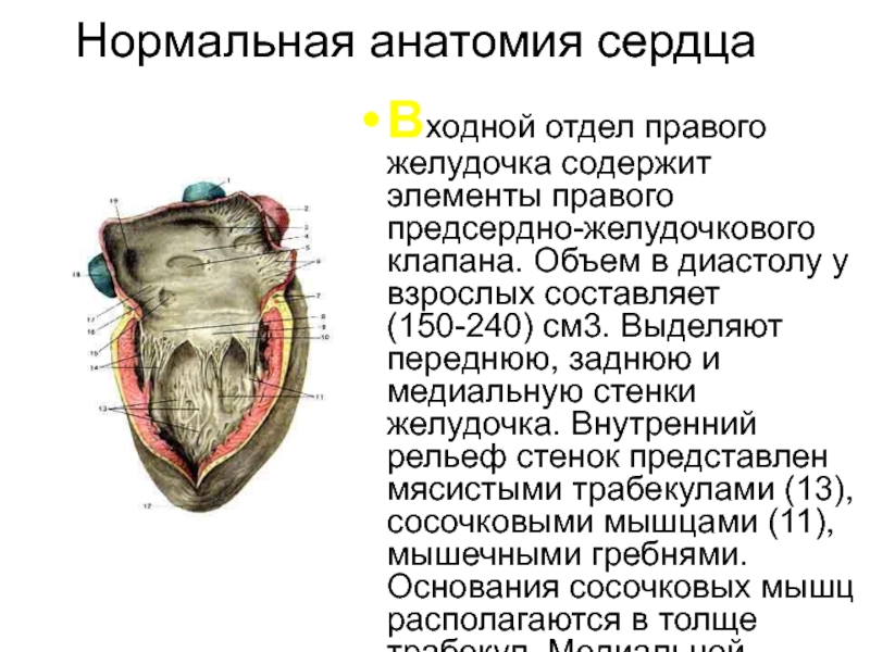 переднюю, заднюю и медиальную стенки желудочка. Внутренний рельеф стенок представлен мясистыми трабекулами (13), сосочковыми мышцами (11), мышечными гребнями. Основания сосочковых мышц располагаются в толще трабекул. Медиальной стенкой служит межжелудочковая перегородка (SIV).