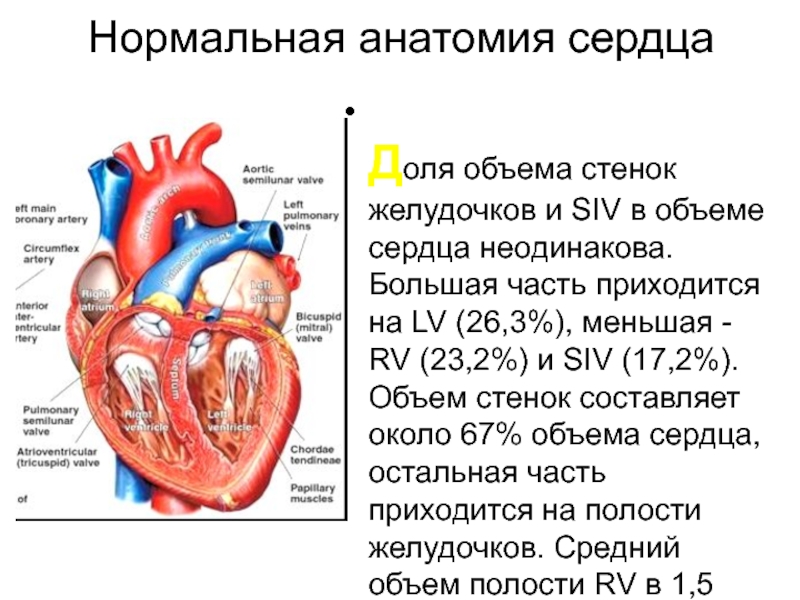 RV (23,2%) и SIV (17,2%). Объем стенок составляет около 67% объема сердца, остальная часть приходится на полости желудочков. Средний объем полости RV в 1,5 раза больше LV.