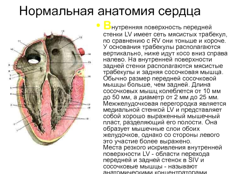 основания трабекулы располагаются вертикально, ниже идут косо вниз справа налево. На внутренней поверхности задней стенки располагаются мясистые трабекулы и задняя сосочковая мышца. Обычно размер передней сосочковой мышцы больше, чем задней. Длина сосочковых мышц колеблется от 10 мм до 50 мм, а диаметр от 2 мм до 25 мм. Межжелудочковая перегородка является медиальной стенкой LV и представляет собой хорошо выраженный мышечный пласт, разделяющий его полости. Она образует мышечные слои обоих желудочков, однако со стороны левого это участие более выражено.