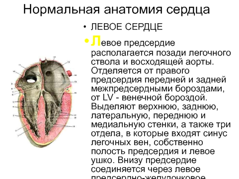 бороздами, от LV - венечной бороздой. Выделяют верхнюю, заднюю, латеральную, переднюю и медиальную стенки, а также три отдела, в которые входят синус легочных вен, собственно полость предсердия и левое ушко. Внизу предсердие соединяется через левое предсердно-желудочковое отверстие с LV. В области верхней стенки предсердия находятся устья легочных вен - чаще четыре, реже пять.