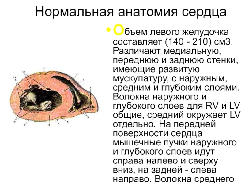 наружным, средним и глубоким слоями. Волокна наружного и глубокого слоев для RV и LV общие, средний окружает LV отдельно. На передней поверхности сердца мышечные пучки наружного и глубокого слоев идут справа налево и сверху вниз, на задней - слева направо. Волокна среднего слоя располагаются циркулярно. Этот слой в LV развит больше, чем в RV, его стенки толще.