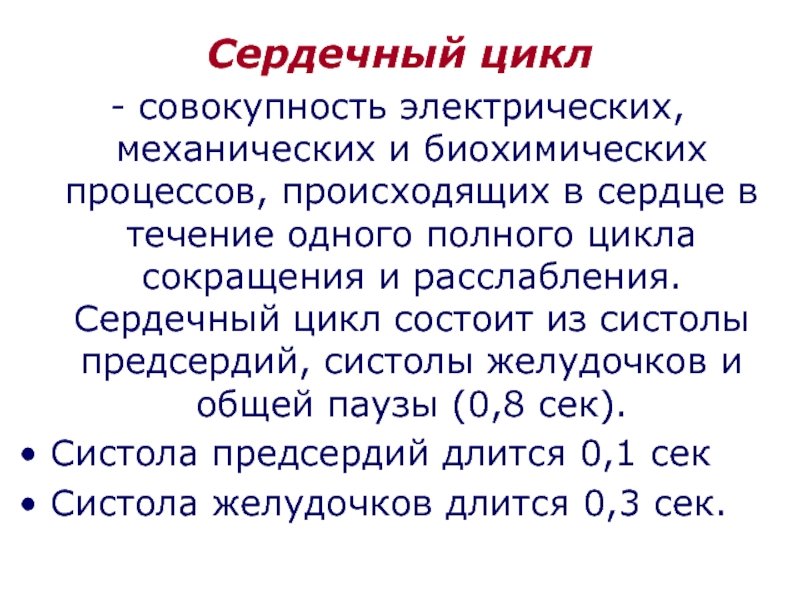 состоит из систолы предсердий, систолы желудочков и общей паузы (0,8 сек).