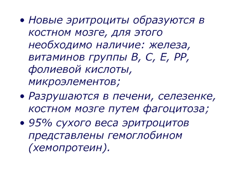 Слайд 13Новые эритроциты образуются в костном мозге, для этого необходимо наличие: