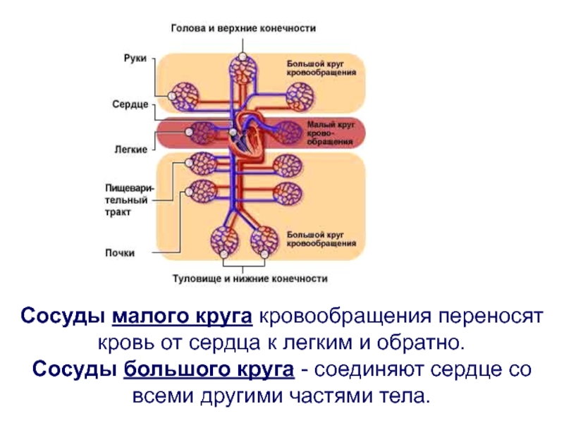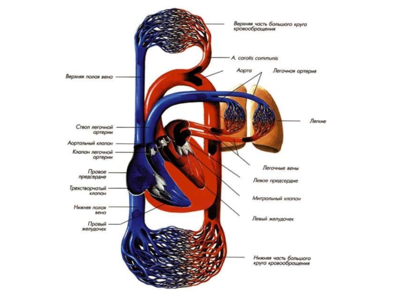 Слайд 35Сосуды малого круга кровообращения переносят кровь от сердца к легким