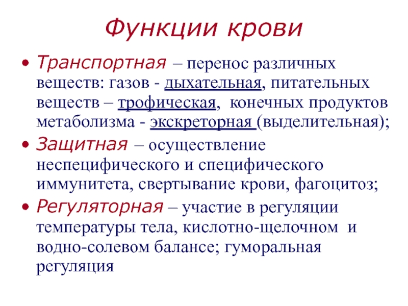 Регуляторная – участие в регуляции температуры тела, кислотно-щелочном и водно-солевом балансе; гуморальная регуляция