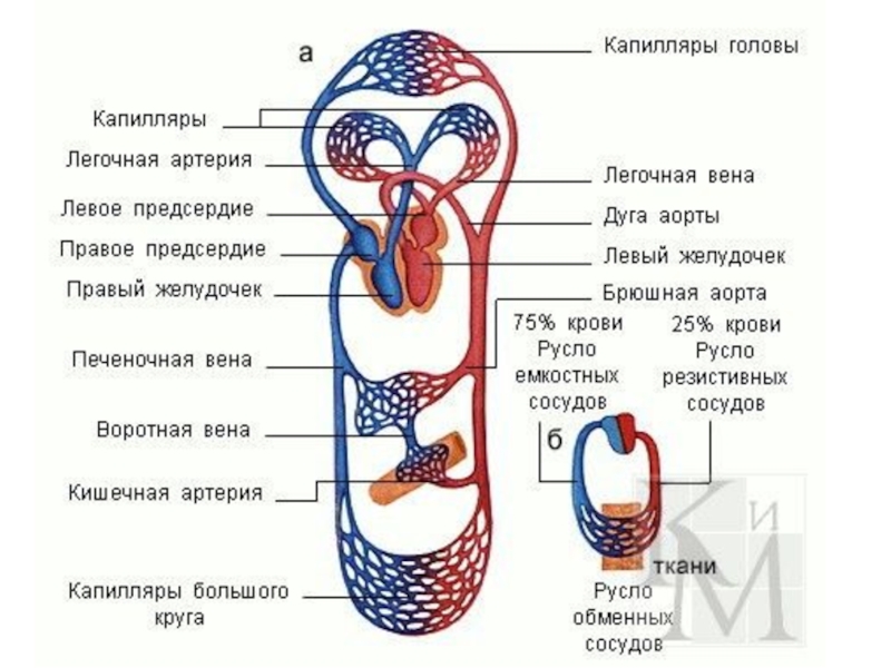 Слайд 33Сердечно-сосудистая система – замкнутая, состоит из 2-х кругов кровообращения.