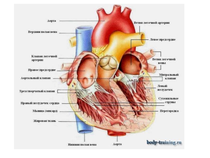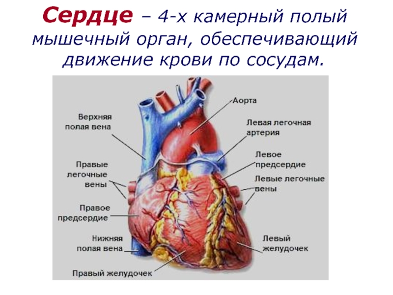 Слайд 29Сердце – 4-х камерный полый мышечный орган, обеспечивающий движение крови