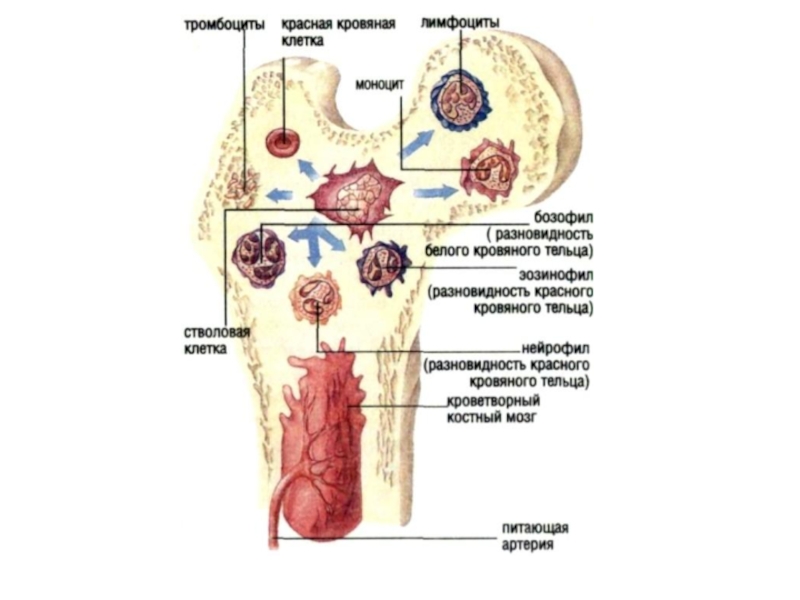 вырабатывает все типы лейкоцитов, эритроцитов и тромбоцитов. Лейкоциты вырабатываются также в селезенке и лимфатических узлах.