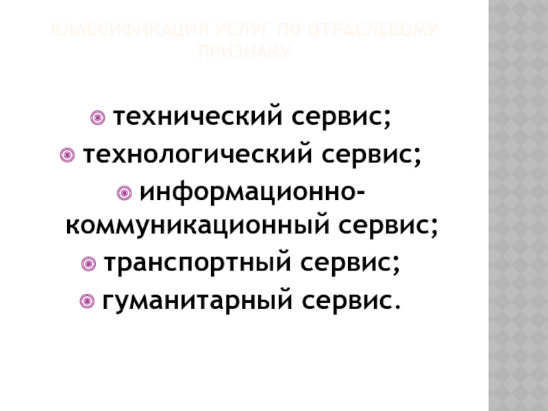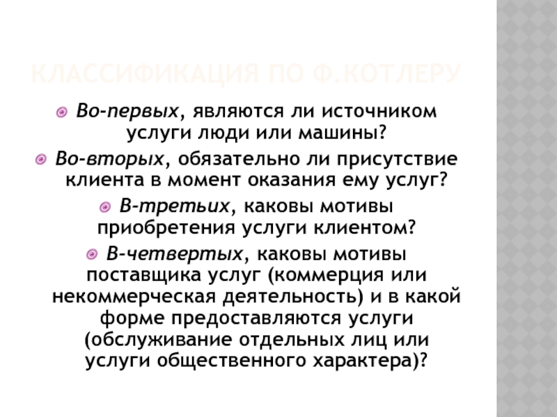 Слайд 10Возможна классификация услуг также по другим признакам: