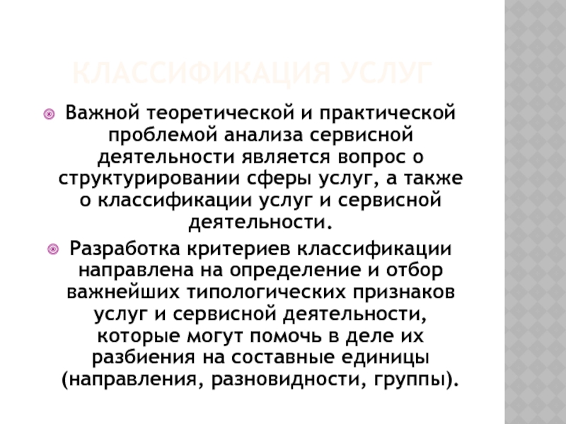 Разработка критериев классификации направлена на определение и отбор важнейших типологических признаков услуг и сервисной деятельности, которые могут помочь в деле их разбиения на составные единицы (направления, разновидности, группы).