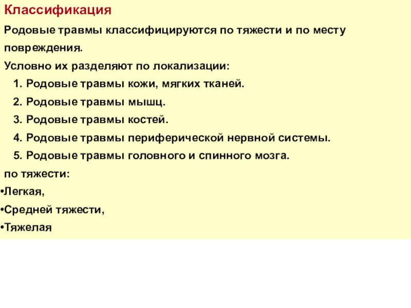 Родовые травмы классифицируются по тяжести и по месту повреждения.