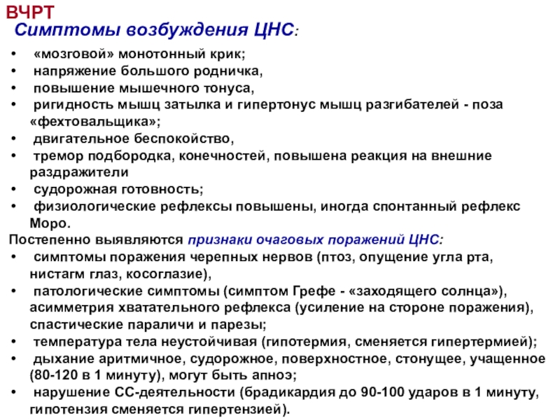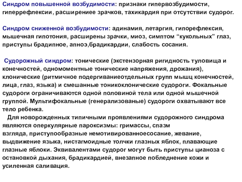 Слайд 28Синдром повышенной возбудимости: признаки гипервозбудимости, гиперрефлексии, расширениее зрачков, тахикардия при отсутствии