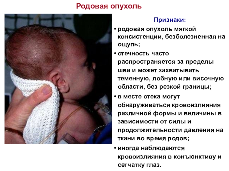 в месте отека могут обнаруживаться кровоизлияния различной формы и величины в зависимости от силы и продолжительности давления на ткани во время родов;
