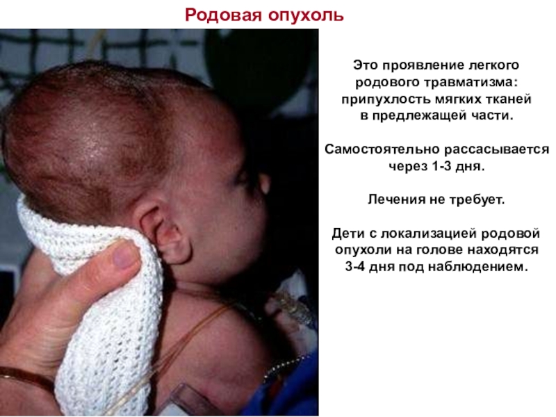 При пальпации - флюктуация и словно валик по периферии. Кожа над кефалогематомой не изменена. В первые дни жизни -увеличивает-ся. Позже возникает длительная желтуха в результате образования внесосудистого билирубина.