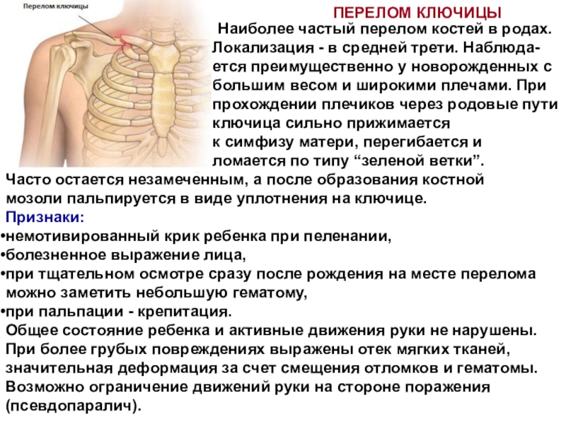 Наиболее частый перелом костей в родах. Локализация - в средней трети. Наблюда-ется преимущественно у новорожденных с большим весом и широкими плечами. При прохождении плечиков через родовые пути ключица сильно прижимается к симфизу матери, перегибается и ломается по типу “зеленой ветки”.