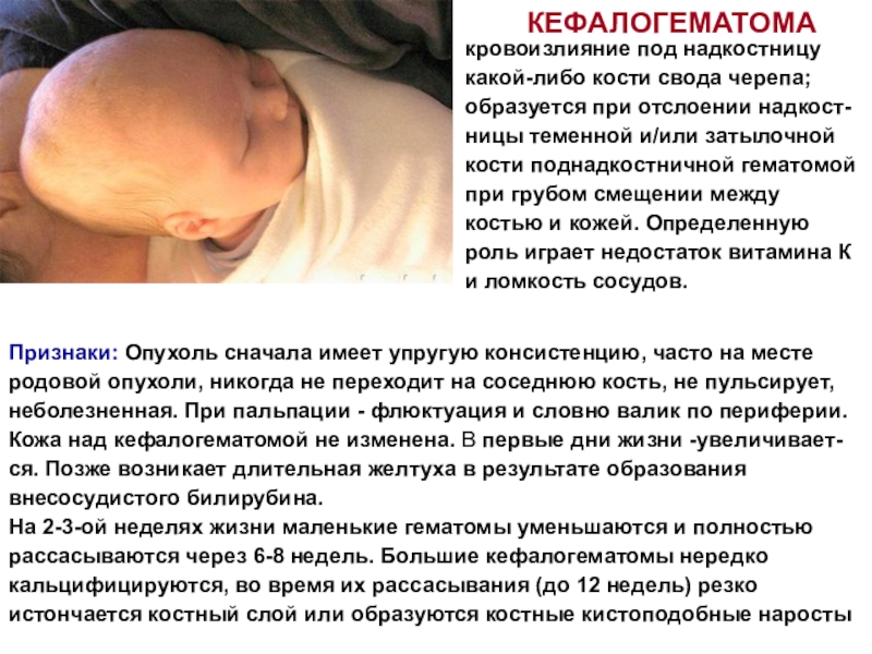 На 2-3-ой неделях жизни маленькие гематомы уменьшаются и полностью рассасываются через 6-8 недель. Большие кефалогематомы нередко кальцифицируются, во время их рассасывания (до 12 недель) резко истончается костный слой или образуются костные кистоподобные наросты