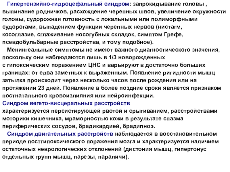 Слайд 29 Гипертензийно-гидроцефальный синдром: запрокидывание головы , выпинание родничков, расхождение черепных швов, увеличение окружности