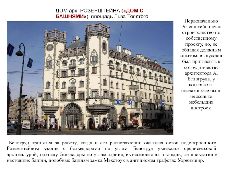 Слайд 14ДОМ арх. РОЗЕНШТЕЙНА («ДОМ С БАШНЯМИ»), площадь Льва Толстого