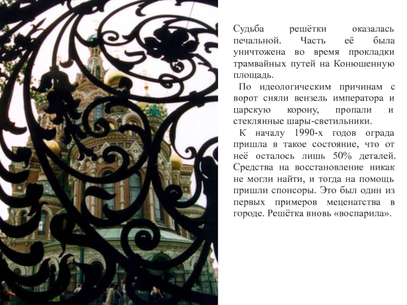Слайд 52Судьба решётки оказалась печальной. Часть её была уничтожена во время