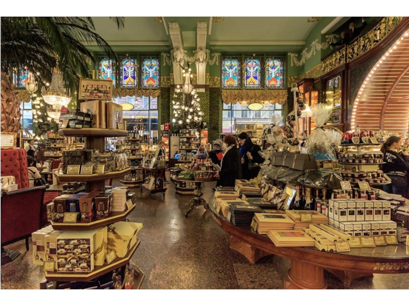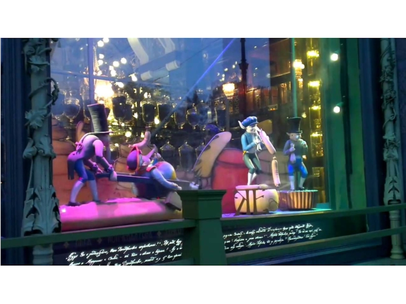 сухариками. Вместе с тем в граните высечены орнаменты из каштановых листьев, а чисто декоративные металлические конструкции, заполнившие арку окна и верхнюю часть витрин, оплетены выкованными стеблями и листвой.