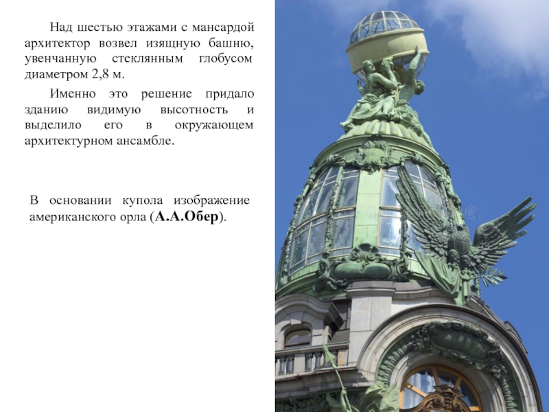 Слайд 27Над шестью этажами с мансардой архитектор возвел изящную башню, увенчанную
