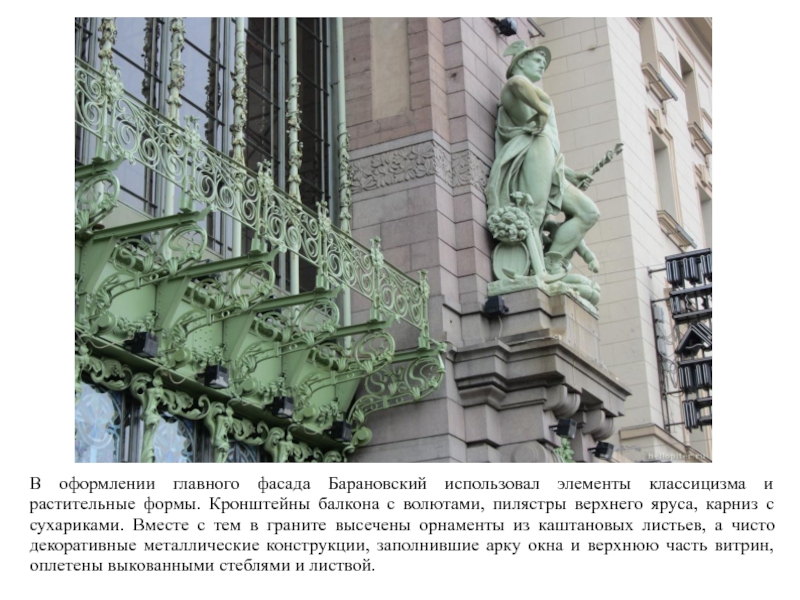 Слайд 31В оформлении главного фасада Барановский использовал элементы классицизма и растительные