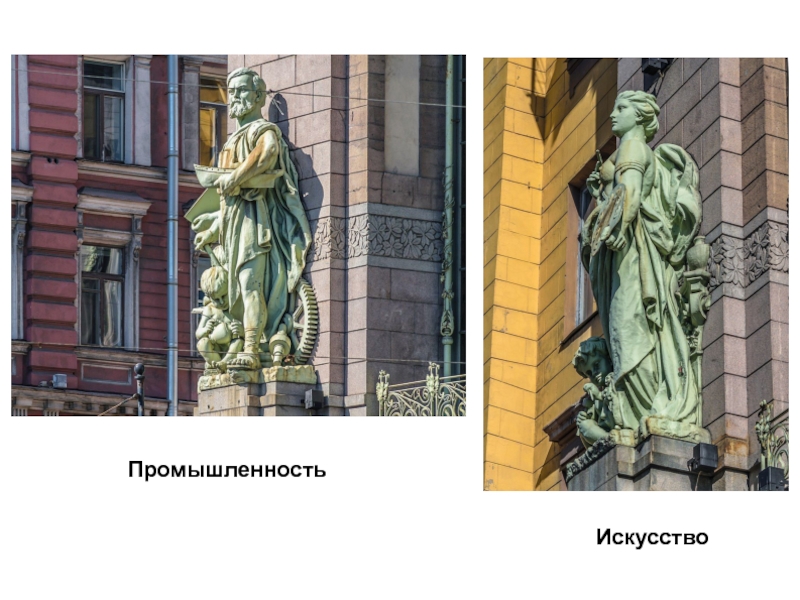 Слайд 26На фасадах размещена символическая скульптура, которая раскрывает функциональное назначение здания.
