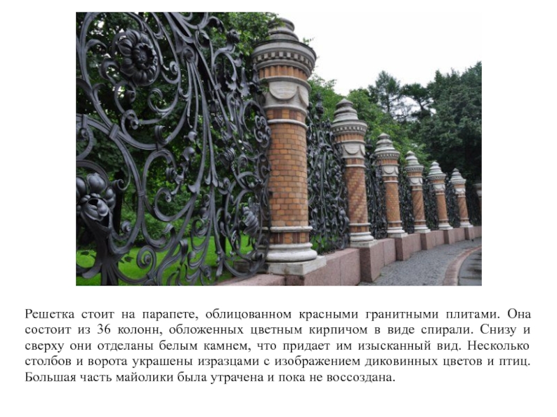 Слайд 51Решетка стоит на парапете, облицованном красными гранитными плитами. Она состоит