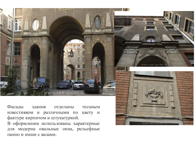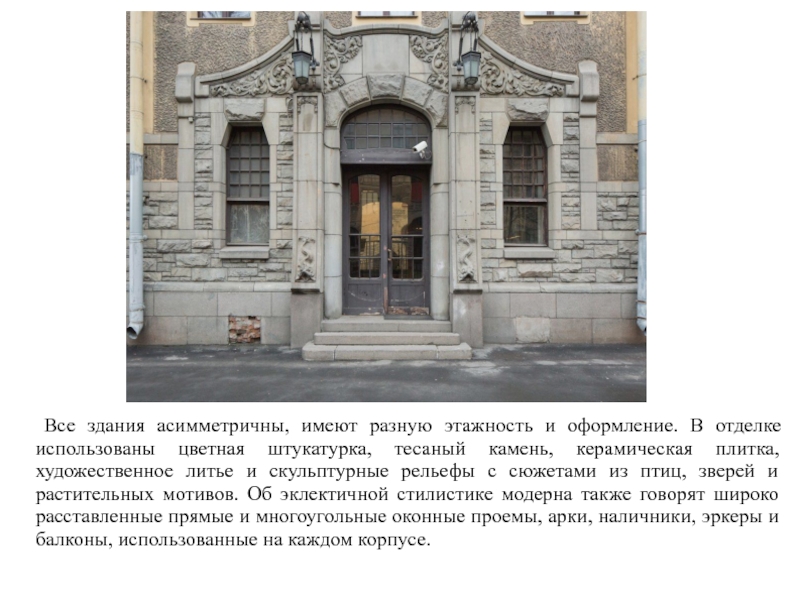 и скульптурные рельефы с сюжетами из птиц, зверей и растительных мотивов. Об эклектичной стилистике модерна также говорят широко расставленные прямые и многоугольные оконные проемы, арки, наличники, эркеры и балконы, использованные на каждом корпусе.