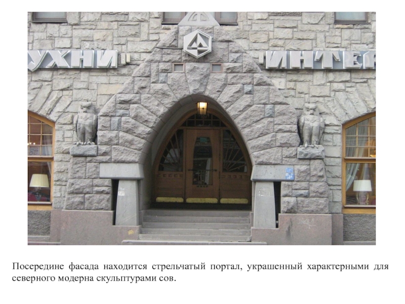 Слайд 13Посередине фасада находится стрельчатый портал, украшенный характерными для северного модерна