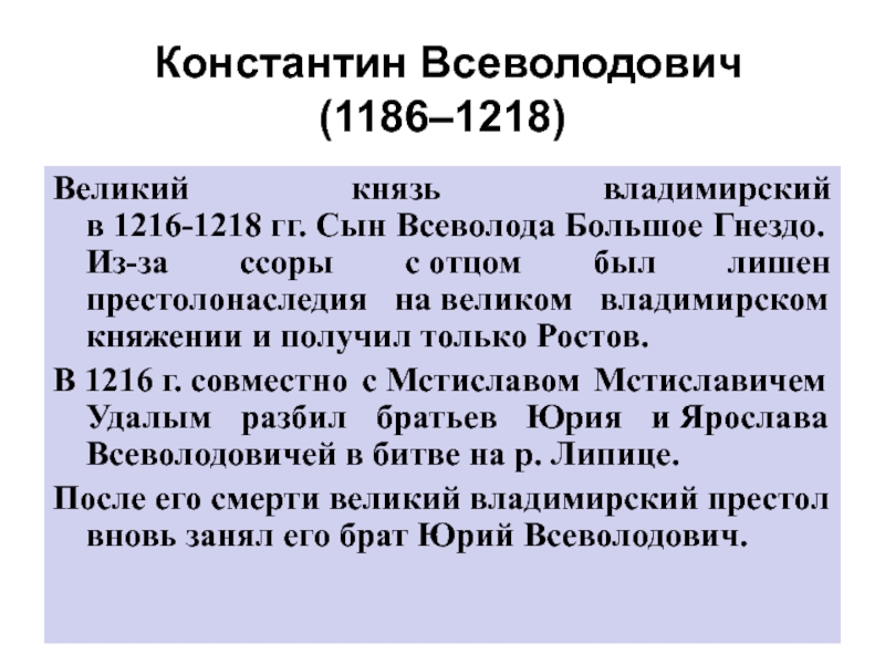 Слайд 64Великий князь владимирский в 1216-1218 гг. Сын Всеволода Большое Гнездо. Из-за ссоры с отцом