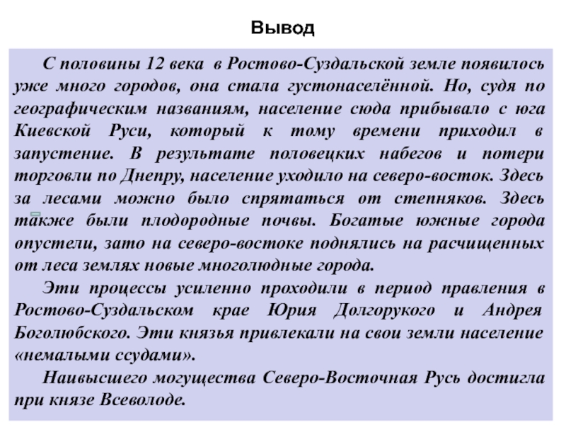 Эти процессы усиленно проходили в период правления в Ростово-Суздальском крае Юрия Долгорукого и Андрея Боголюбского. Эти князья привлекали на свои земли население «немалыми ссудами».