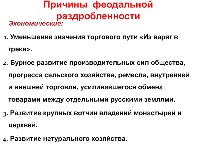 Господство натурального хозяйства, способность отдельных княжеств и городов обеспечить себя всем необходимым.