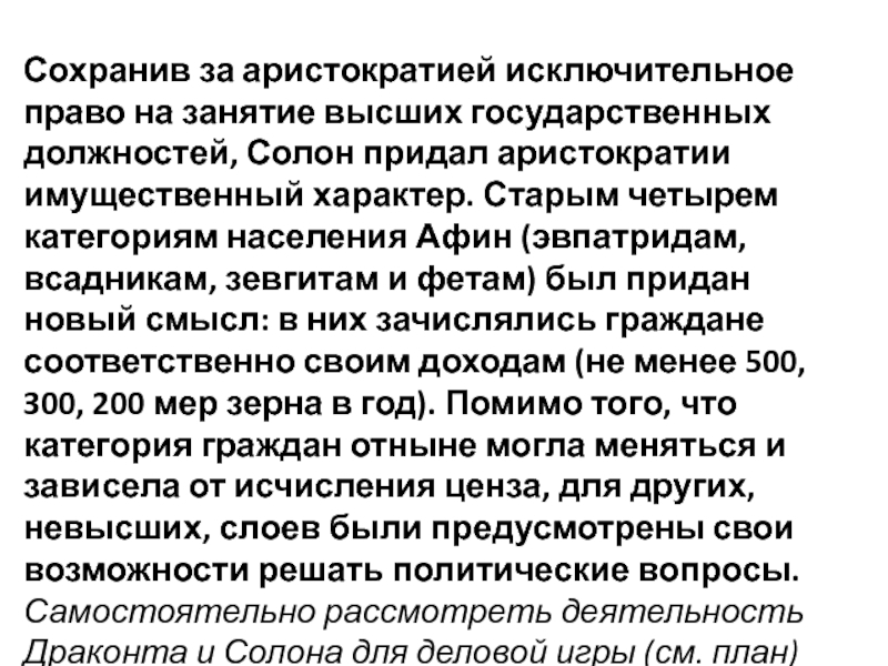 (эвпатридам, всадникам, зевгитам и фетам) был придан новый смысл: в них зачислялись граждане соответственно своим доходам (не менее 500, 300, 200 мер зерна в год). Помимо того, что категория граждан отныне могла меняться и зависела от исчисления ценза, для других, невысших, слоев были предусмотрены свои возможности решать политические вопросы.