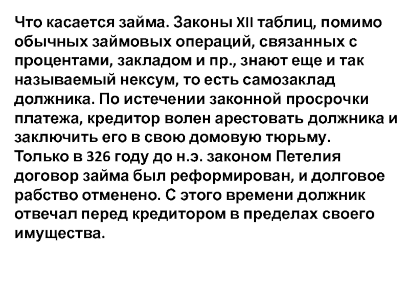 Слайд 54Что касается займа. Законы XII таблиц, помимо обычных займовых операций,