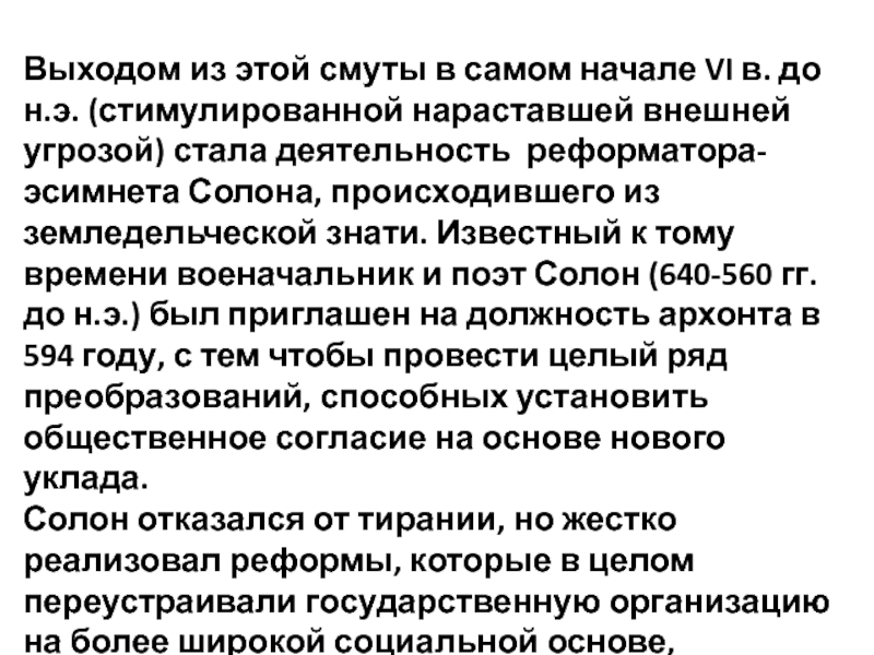 Слайд 15Выходом из этой смуты в самом начале VI в. до