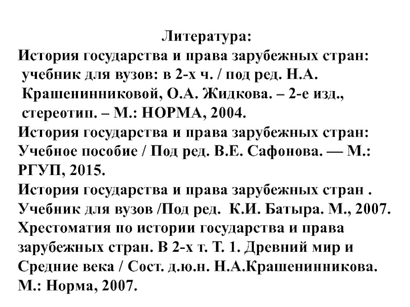 История государства и права зарубежных стран . Учебник для вузов /Под ред. К.И. Батыра. М., 2007.