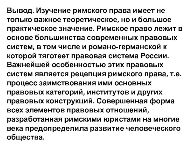 Слайд 60Вывод. Изучение римского права имеет не только важное теоретическое, но