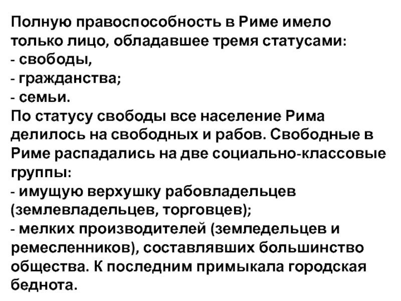 Слайд 42Полную правоспособность в Риме имело только лицо, обладавшее тремя статусами: