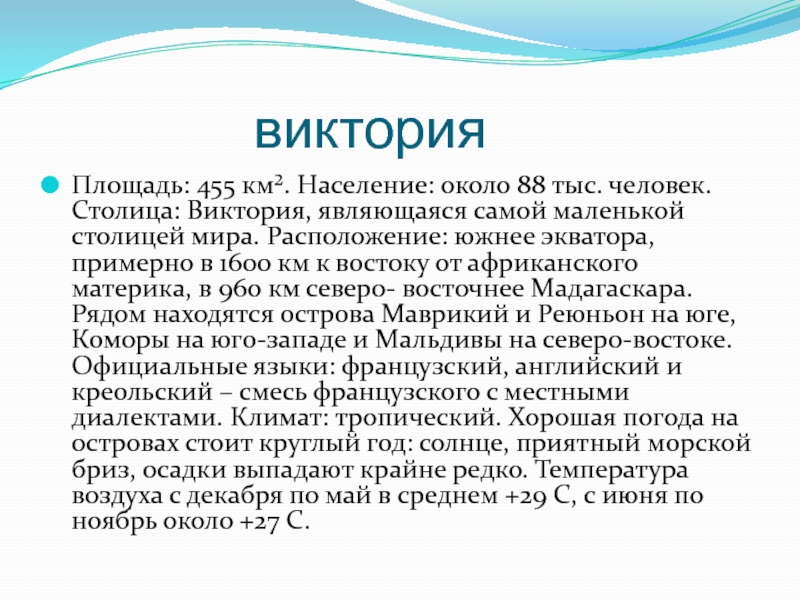 самой маленькой столицей мира. Расположение: южнее экватора, примерно в 1600 км к востоку от африканского материка, в 960 км северо- восточнее Мадагаскара. Рядом находятся острова Маврикий и Реюньон на юге, Коморы на юго-западе и Мальдивы на северо-востоке. Официальные языки: французский, английский и креольский – смесь французского с местными диалектами. Климат: тропический. Хорошая погода на островах стоит круглый год: солнце, приятный морской бриз, осадки выпадают крайне редко. Температура воздуха с декабря по май в среднем +29 С, с июня по ноябрь около +27 С.