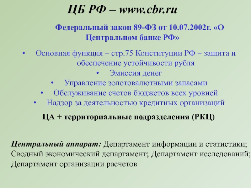 Федеральный закон 89-ФЗ от 10.07.2002г. «О Центральном банке РФ»
